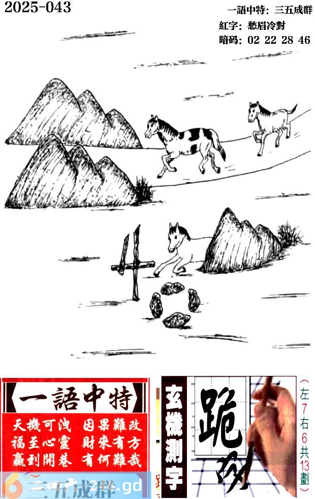 043期跑狗一字記之曰:【跑】 四蹄騰踏,駿馬奔跑。 青石作幕,壹路嘶風。 玄機測字:《跪》 一語中特:三五成群