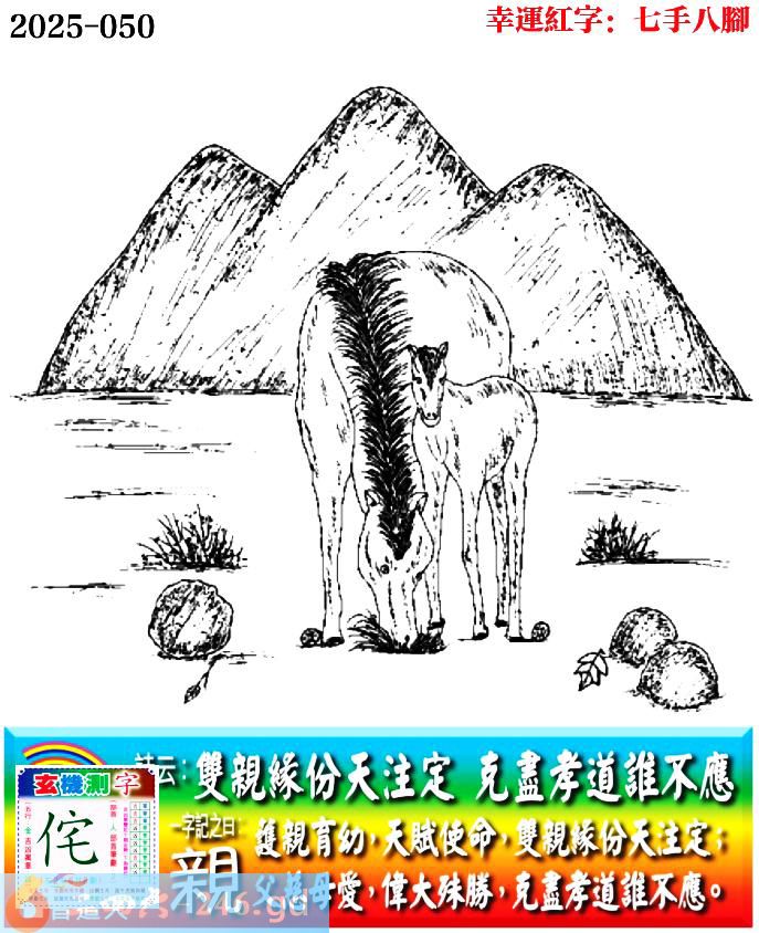 050期老版跑狗一字記之曰:【親】 詩雲:雙親緣份天注定,克盡孝道誰不應。 護親育幼,天賦使命,雙親緣份天注定; 父慈母愛,偉大殊勝,克盡孝道誰不應。 玄機測字:《侘》