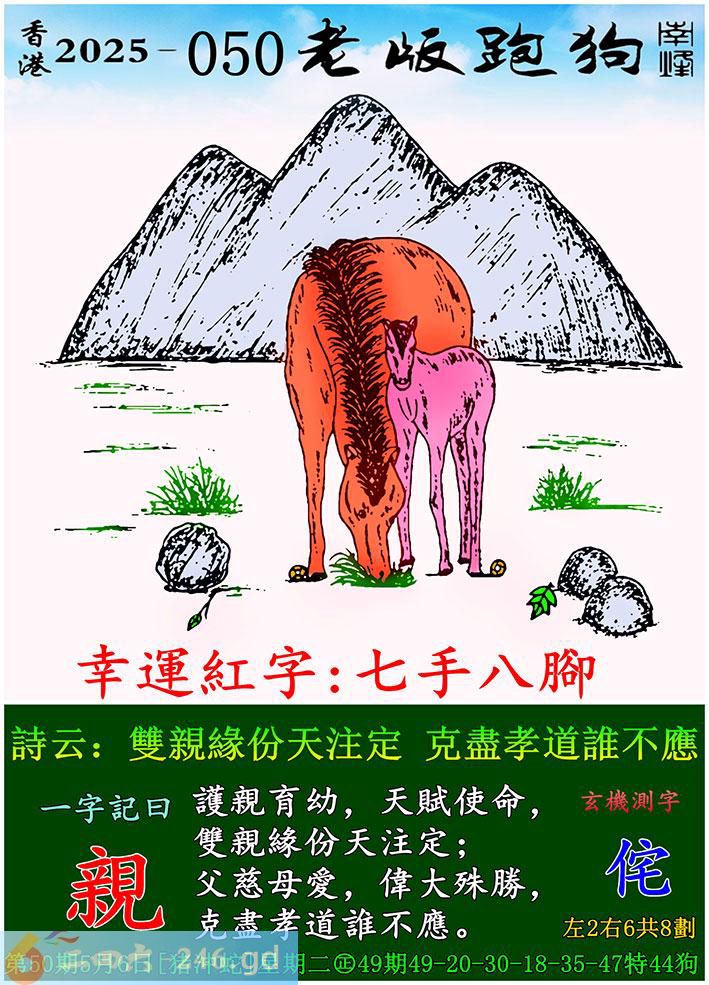 050期老版跑狗一字記之曰:【親】 詩雲:雙親緣份天注定,克盡孝道誰不應。