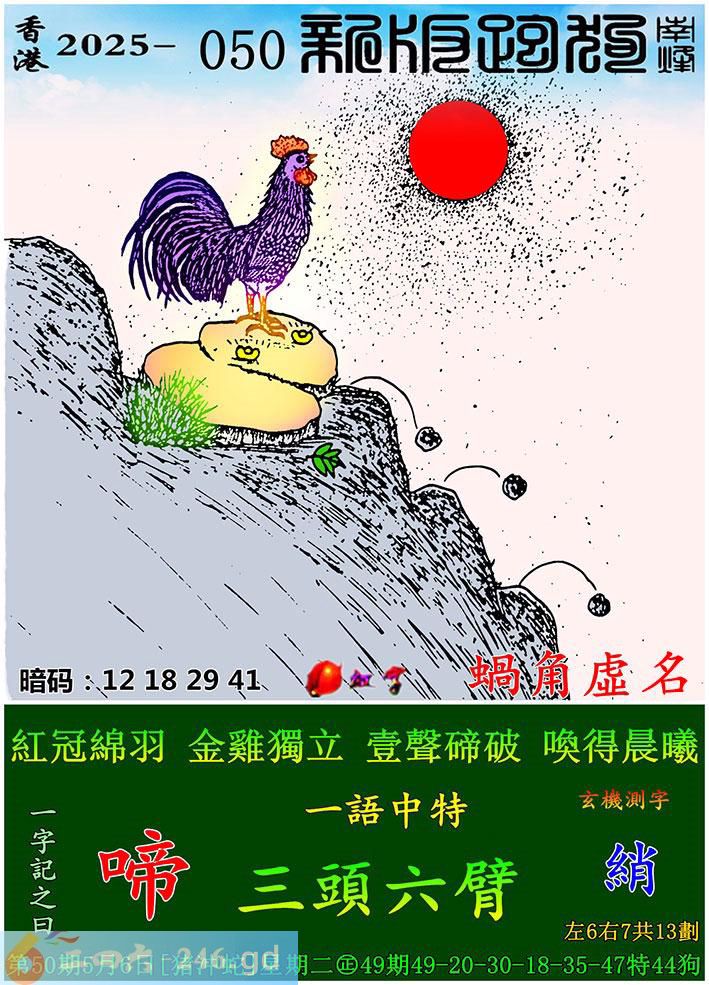 050期跑狗一字記之曰:【啼】 紅冠綿羽,金雞獨立。 壹聲碲破,喚得晨曦。 玄機測字:《綃》 一語中特:三頭六臂