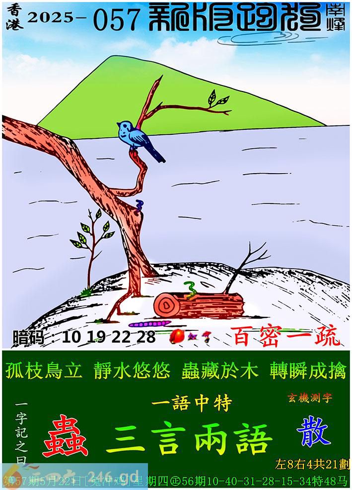 057期跑狗一字記之曰:【蟲】 孤枝鳥立,靜水悠悠。 蟲藏於木,轉瞬成擒。 玄機測字:《散》 一語中特:三言兩語