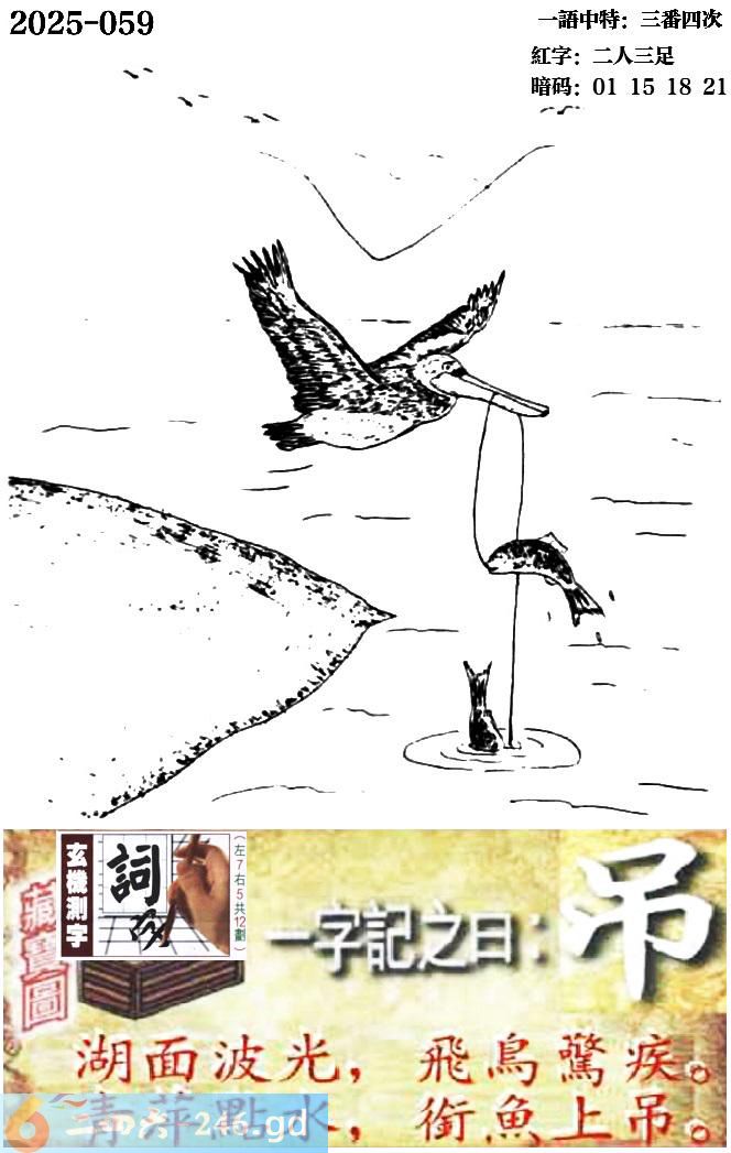 059期跑狗一字記之曰:【吊】 湖面波光,飛鳥驚疾。 青萍點水,銜魚上吊。 玄機測字:《詞》 一語中特:三番四次