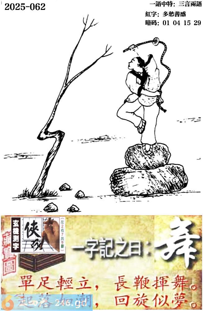 062期跑狗一字記之曰:【舞】 單足輕立,長鞭揮舞。 起落如潮,回旋似夢。 玄機測字:《俠》 一語中特:三言兩語