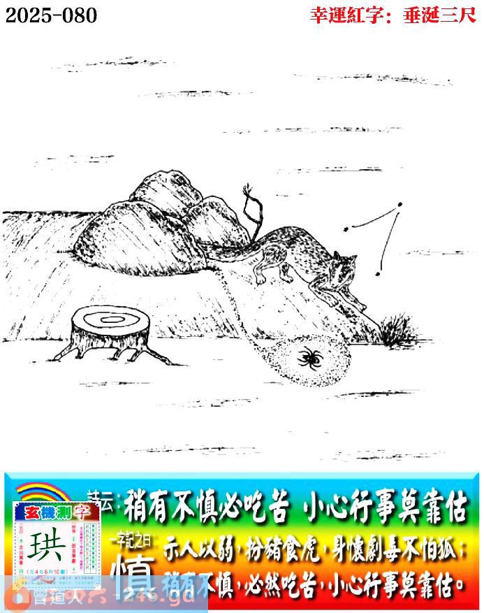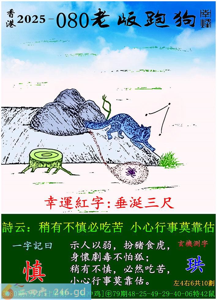 080期老版跑狗一字記之曰:【慎】 詩雲:稍有不慎必吃苦,小心行事莫靠估。 示人以弱,扮豬食虎,身懷劇毒不怕狐; 稍有不慎,必然吃苦,小心行事莫靠估。 玄機測字:《珙》