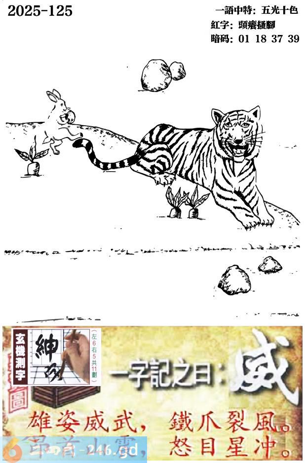 125期跑狗一字記之曰:【威】 雄姿威武,鐵爪裂風。 昂首山震,怒目星沖。