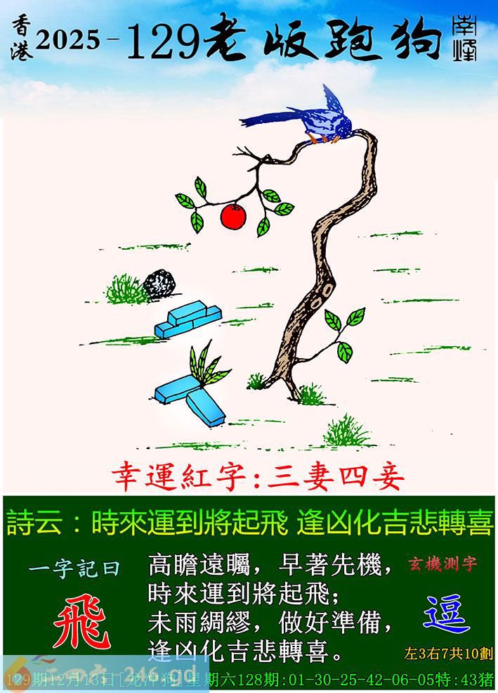 129期老版跑狗一字記之曰:【飛】 詩雲:時來運到將起飛,逢凶化吉悲轉喜。