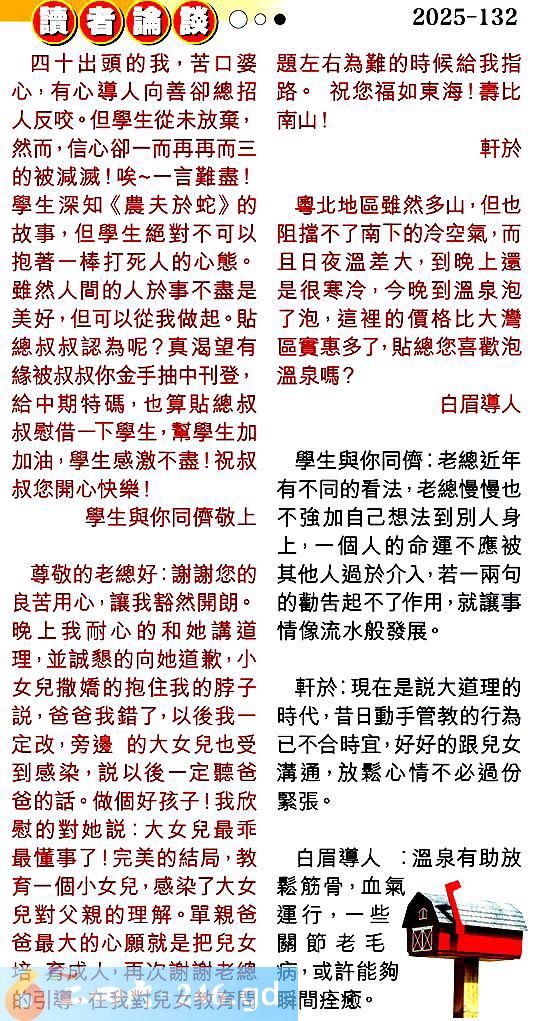 第一三二期讀者論談 1.四十出頭的我,苦口婆心,有心導人向善卻總招人反咬。但學生從未放棄,然而,信心卻一而再再而三的被減滅!唉一言難盡!學生深知《農夫於蛇》的故事,但學生絕對不可以抱著一棒打死人的心態。雖然人間的人於事不盡是美好,但可以從我做起。貼總叔叔認為呢?真渴望有緣被叔叔你金手抽中刊登,給中期特碼,也算貼總叔叔慰借一下學生,幫學生加加油,學生感激不盡!祝叔叔您開心快樂!學生與你同儕敬上 〖學生與你同儕〗:老總近年有不同的看法,老總慢慢也不強加自己想法到別人身上,一個人的命運不應被其他人過於介入,若一兩句的勸告起不了作用,就讓事情像流水般發展。 2.尊敬的老總好:謝謝您的良苦用心,讓我豁然開朗。晚上我耐心的和她講道理,並誠懇的向她道歉,小女兒撒嬌的抱住我的脖子說,爸爸我錯了,以後我一定改,旁邊的大女兒也受到感染,說以後一定聽爸爸的話。做個好孩子!我欣慰的對她說:大女兒最乖最懂事了!完美的結局,教育一個小女兒,感染了大女兒對父親的理解。單親爸爸最大的心願就是把兒女培育成人,再次謝謝老總的引導,在我對兒女教育問題左右為難的時候給我指路。祝您福如東海!壽比南山!軒於 〖軒於〗:現在是說大道理的時代,昔日動手管教的行為已不合時宜,好好的跟兒女溝通,放鬆心情不必過份紧張。 3.粤北地區雖然多山,但也阻擋不了南下的冷空氣,而且日夜溫差大,到晚上還是很寒冷,今晚到溫泉泡了泡,這裡的價格比大灣區實惠多了,貼總您喜歡泡溫泉嗎?白眉導人 〖白眉導人〗:溫泉有助放鬆筋骨,血氣運行,一些四關節老毛病,或許能夠瞬間痊癩。