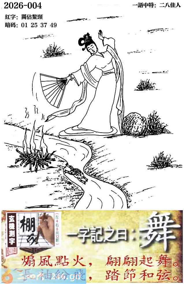 004期跑狗一字記之曰:【舞】 煽風點火,翩翩起舞。 長袖紛飛,踏節和弦。