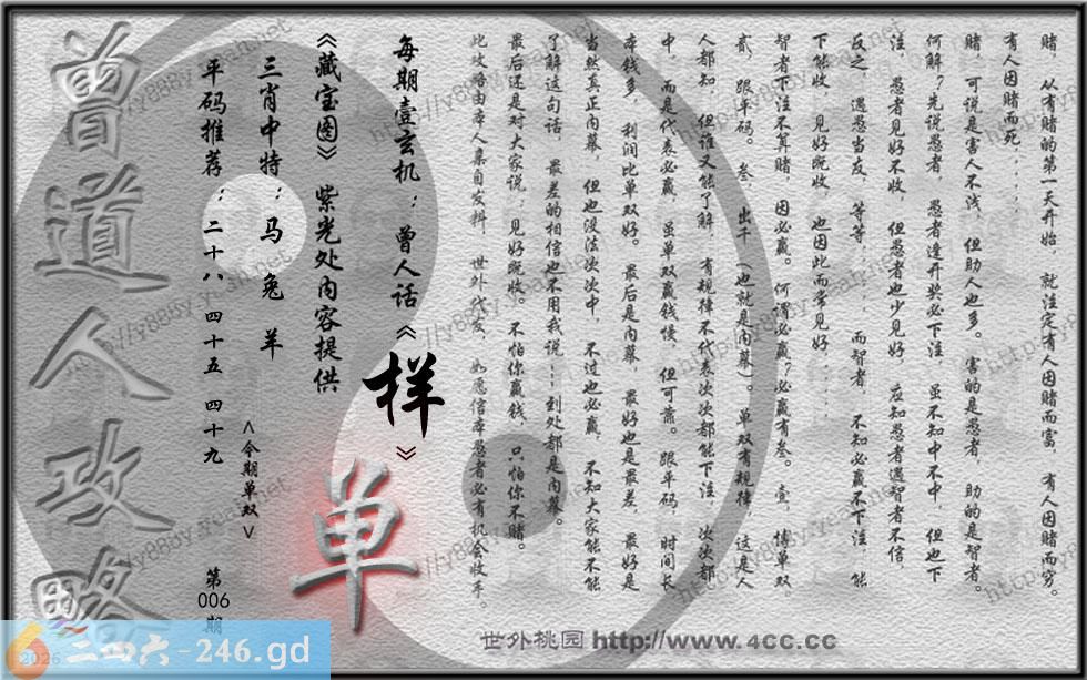 006期藏寶圖 新:欲往宁辞沔水深 老:水鸡衔鱼来去飞 禁:猴 禁:4尾 玄機字:《样》