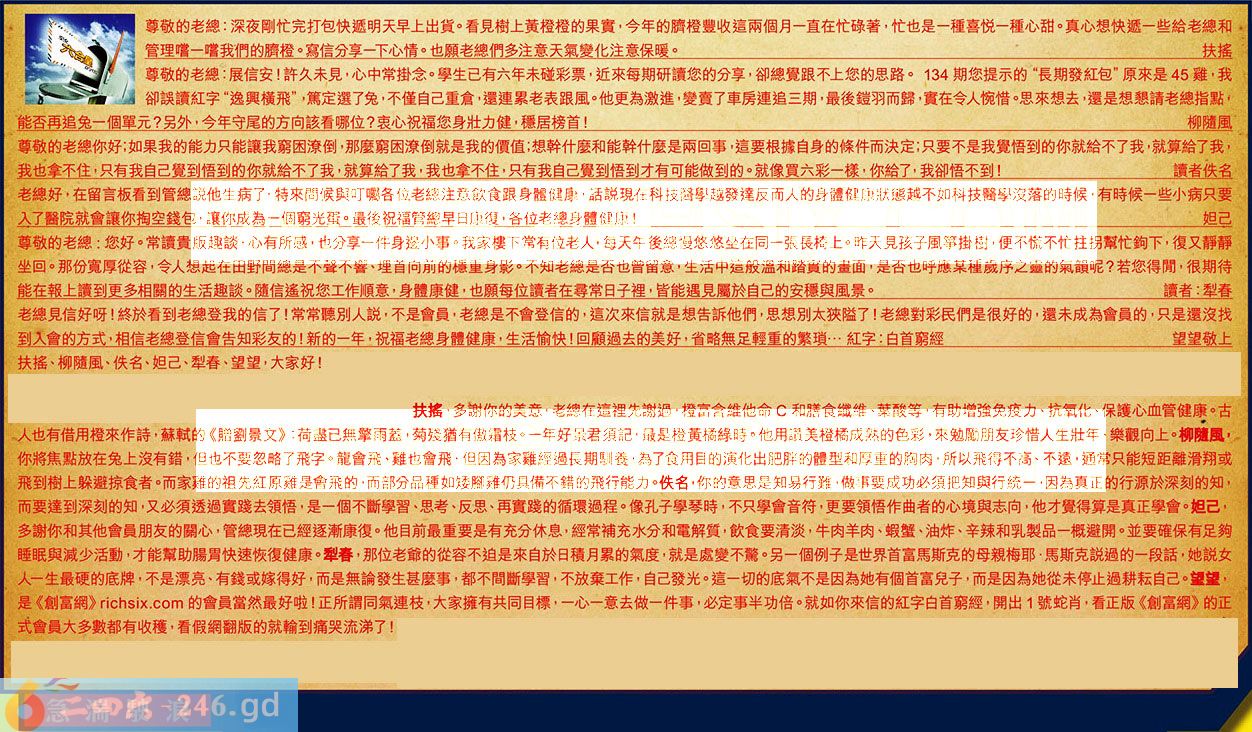 【2】.尊敬的老總:展信安!許久未見,心中常掛念。學生已有六年未碰彩票,近來每期研讀您的分享,卻總覺跟不上您的思路。134期您提示的“長期發紅包”原來是45難,我卻誤讀紅字“逸興横飛”,篤定選了兔,不僅自己重倉,逻連累老表跟風。他更為激進,變賣了車房連追三期,最後鎧羽而歸,實在令人惋惜。思來想去,還是想懇請老總指點,能否再追兔一個單元?另外,今年守尾的方向該看哪位?衷心祝福您身壯力健,穩居榜首!柳隨風