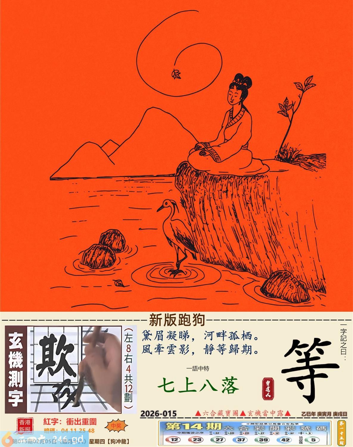 2026年2月5日015期龙(甲辰)(钗钏金) 015期:老版跑狗玄機一字記之曰:【馬】 詩云:馬到成功福延綿下定決心不怕遲 突破重圍,闖出新天,馬到成功福延綿; 時逢立春,新年已至,下定決心不怕遲。 玄機測字:《炸》 密圖詩:一臉家逼買三四 《記》:八面來風臘月會 特碼大小單雙句:小小買注二十塊 今期必中:馬岱 015期:特碼歇后語 嘴上无毛-----办事不牢 015期正版四字梅花诗:避而远之。 015期火车头:烧伤马。诗:鸡死狗伤,困龙暂且藏淤泥。 015期香港第一手欲钱料:二一。 015期曾道人说:“原油?” 015期另版四字梅花诗:四三发财。 015期香港第一手欲钱料:欲钱去看温柔可爱的动物。 015期曾道人说:“请问太阳为什么可以发电”? 015期:二字經:收藏 015期:面包是特码 015期:智力金壤;千钧一发 015期:信箱紅字:【衝出重圍】 015期:【暗碼:04-11-25-48】 015期:一語中特:【七上八落】 發財玄機圖:敏感非常弓身防禦圖中明蛇紅綠 015期:藏寶圖 新:蓬阁桃源两处分 老:江山王气空千劫 禁:马禁:7尾玄機字《象》 2026年015期【生活幽默】版 〖知音在此〗 某書生酷爱彈琴,常常感慨知音難尋,鬱鬱不樂。 一日在房中彈琴清遣,忽聞隔壁有嘆息之聲。書生大喜:"原來知音在此呀!" 歡歡喜喜地去鄰家叩門。開門的却是個老婦。老婦哭着説:"觸景生情啊,我兒子生前以彈棉花爲生,先生您彈的太像他了。"
