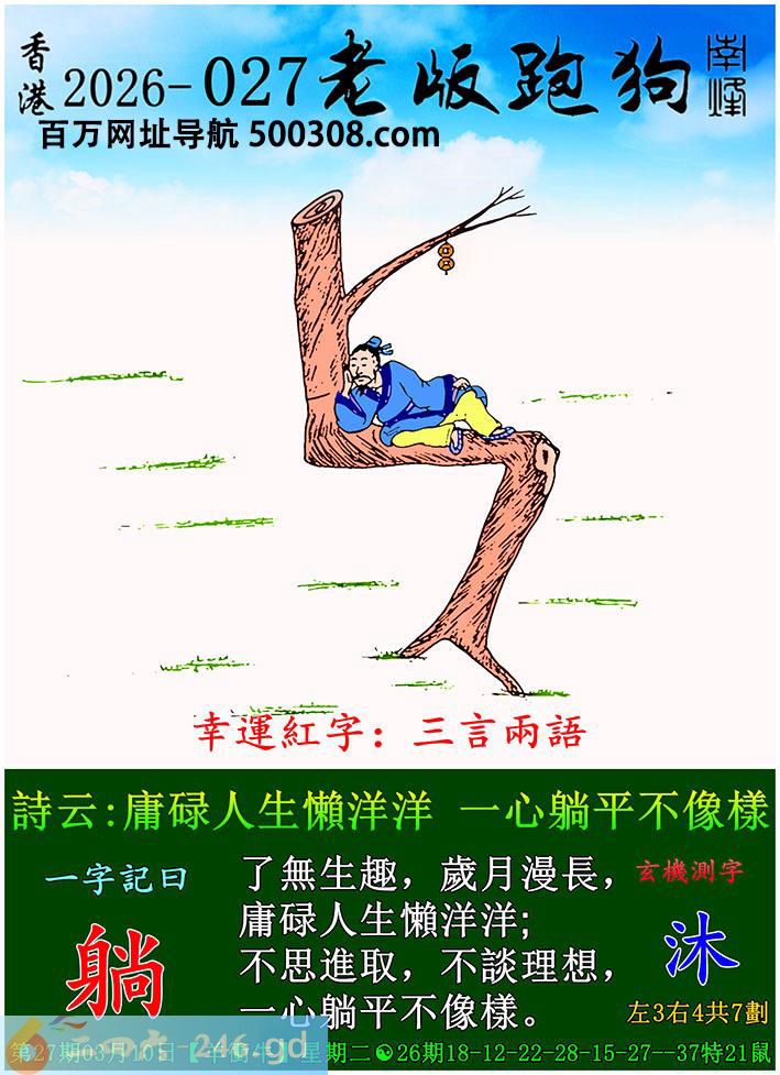 027期老版跑狗一字記之曰:【躺】 詩雲:庸碌人生懶洋洋,一心躺平不像樣。 了無生趣,歲月漫長,庸碌人生懶洋洋; 不思進取,不談理想,一心躺平不像樣 图中树形状,一男子躺平!不思进取,岁月漫长,刚改岁,人生巅峰今年马年刚开始不着急,希望作者这是送钱给咱们!!!至于号码看尾句似乎五行是火49树上有串铜钱13 马主4913